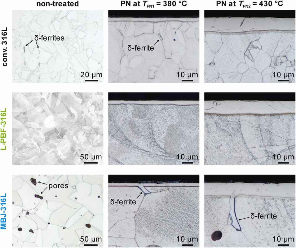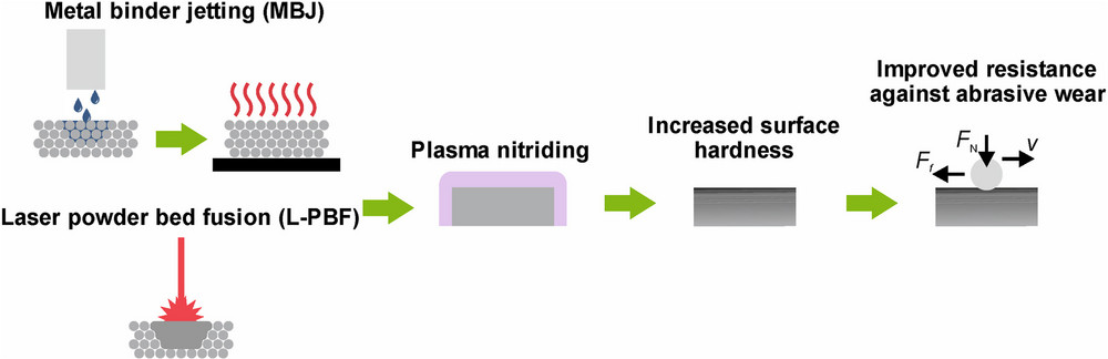 Forschende vom Lehrstuhl für Werkstofftechnologie (LWT) der Technischen Universität Dortmund haben in Kooperation mit GKN Powder Metallurgy GmbH & Co. KG und Oerlikon Balzers Coating Germany GmbH das Plasmanitrierverhalten von 316L-Edelstahl untersucht, der mittels laserbasiertem Pulverbettfusionieren (engl. laser powder bed fusion, kurz L-PBF) und Metal Binder Jetting (engl. metal binder jetting, kurz MBJ) gefertigt wurde. Im Fokus stand dabei der Einfluss der herstellungsspezifischen Mikrostrukturen auf die resultierenden mechanischen und tribologischen Eigenschaften.